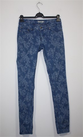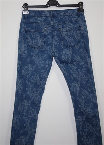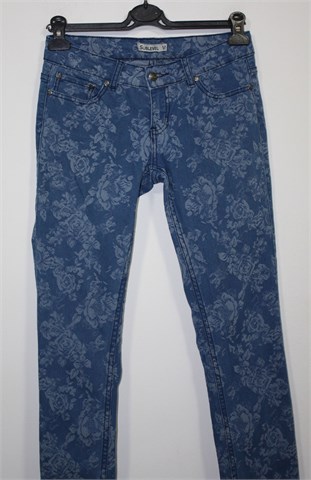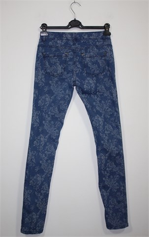 Sublevel traper hlače plave boje sa cvjetnim uzorkom (vidljivo na slikama). Prednji cif i kopčanje, pasica za remen. Prednji i stražnji džepovi. Uske nogavice (skinny model), vrlo rastezljive.