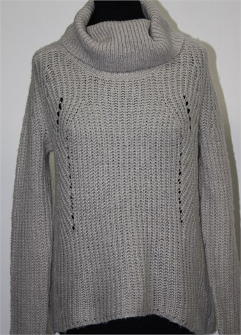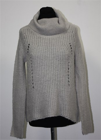 SuiteBlanco vesta/dolčevita sa dugim rukavima, svijetlo sive boje. Blagi rupičasti uzorak sa prednje strane (vidljivo na slici). Stražnja strana je nešto duža od prednje (vidjeti mjere). Mekano i mucasto pletivo, srednje debljine.