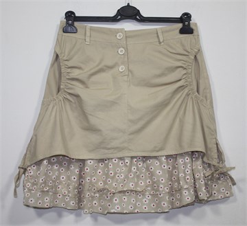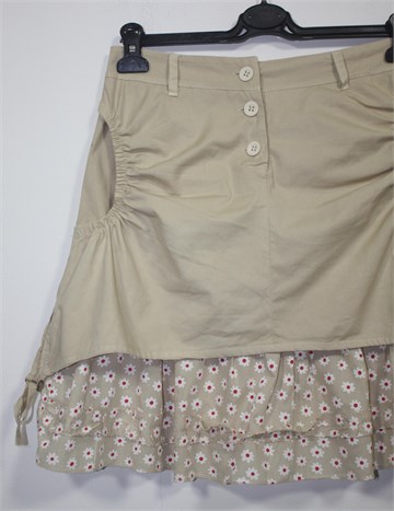 Suknja bež boje sa prednjim kopčanjem, ukrasnim bočnim džepovima (otvoreni su) i ukrasnim bočnim vezanjem. Na podstavu je našiven materijal sa cvjetnim printom koji se vidi sa prednje i stražnje strane kao donji sloj suknje. Čvrst i blago rastezljiv materijal.