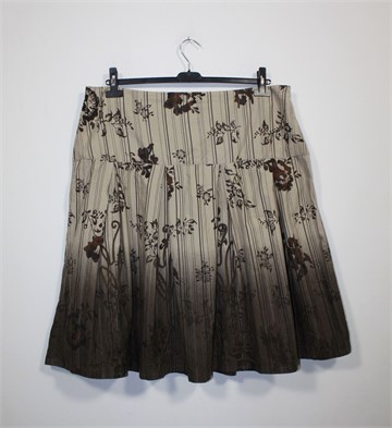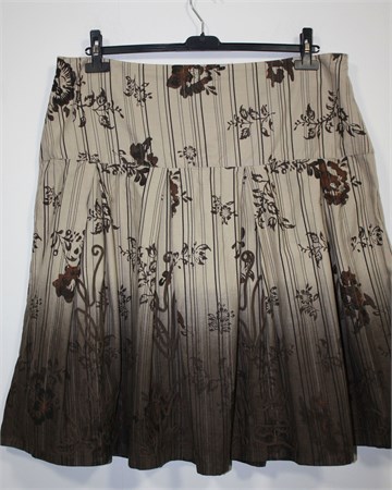 Suknja bež-smeđe boje sa printom (boje i uzorci kao na slikama) i našivenim smeđim aplikacijama na dnu suknje. Stražnji cif i gumbić, falde sa prednje i stražnje strane. Sa stražnje strane pasice (bočno sa obje strane) su ušivene gumice pa je širina blago prilagodljiva (vidjeti mjere).