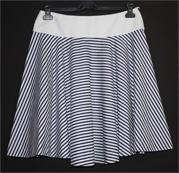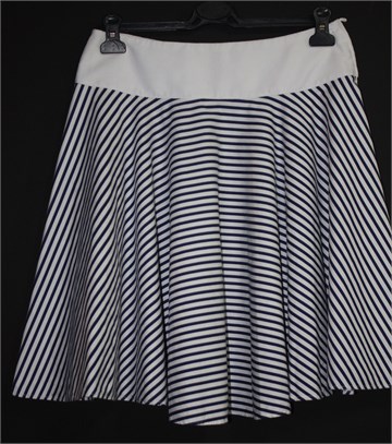 Suknja bijele boje sa plavim prugama, lagana i lepršava. Bočni cif i gumbić, lagani pamučni materijal.