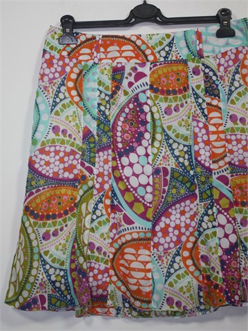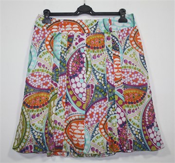 Suknja bijele boje sa šarenim printom. Stražnji cif, pasica za remen. Podstavljena. Ugodan i tanak pamuk.