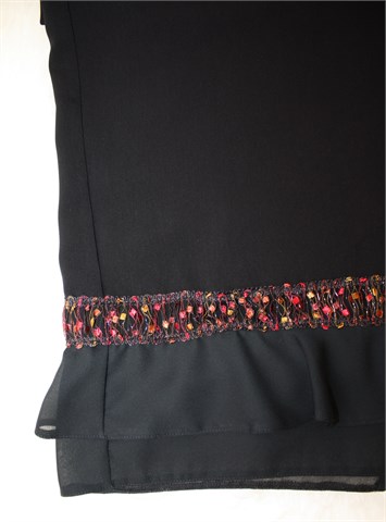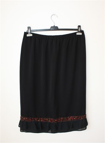 Q'Neel dugačka suknja crne boje, na dnu suknje šarene aplikacije od konca (vidljivo na slikama). U struku guma (prilagodljiva širina), sa stražnje strane prorez.
