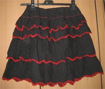 Suknja na falde, crne boje sa bijelim točkicama, obrubi su crvene boje. U struku gumica. Šivana, unikat.