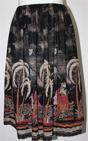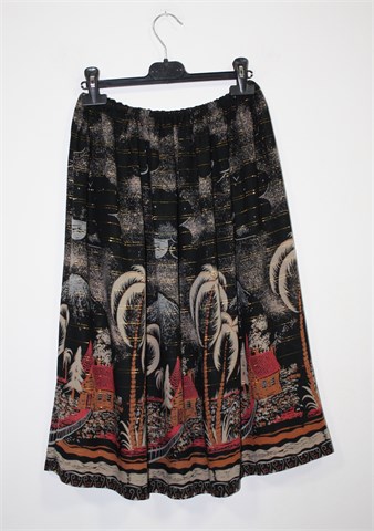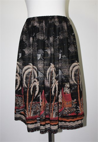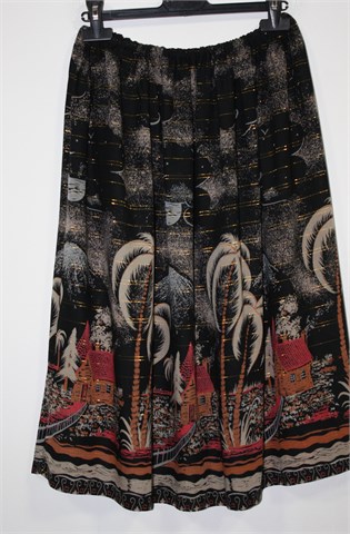 Šivana suknja crne boje sa šarenim (pomalo tropical) printom i sjajnim zlaćanim prugama. Gumica u struku pa je širina prilagodljiva. Lagan i prozračan materijal, tanak. Duža, ručno porubljena i rub bi se mogao otpustiti za još cca 14 cm.