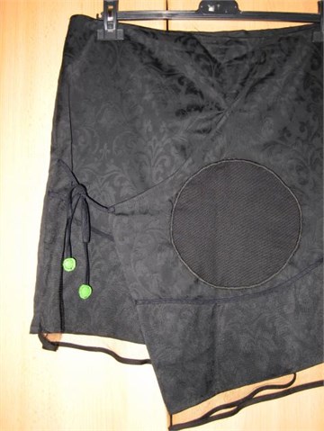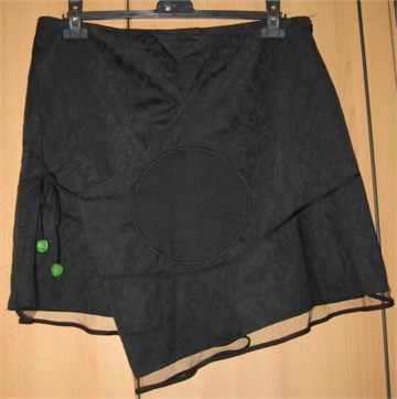 Šivana i unikatna suknja. Crne boje, prednji dio na vezanje sa vezicama pa djeluje kao da je na preklop ali je zašiven. Na prednji rub suknje našiven je til koji izviruje ispod same suknje. Bočni cif.