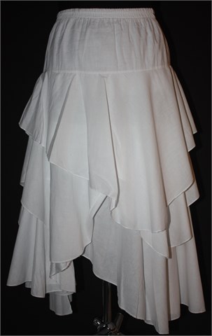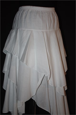 Midi suknja bijele boje, asimetričnog kroja sa volanima. Gumica u struku pa je širina prilagodljiva. Lagana i lepršava (nije podstavljena ali nije prozirna).