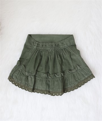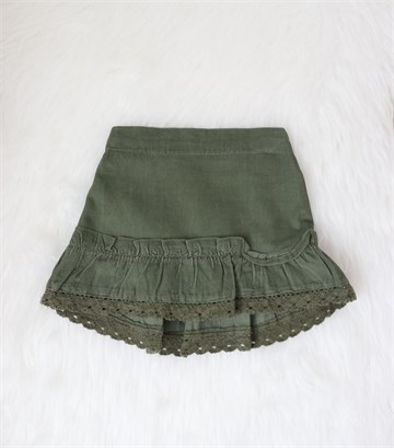Suknja od mekanog i tanjeg samta, maslinasto zelene boje. Sa stražnje strane pasice je gumica pa je širina prilagodljiva (vidjeti mjere).