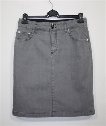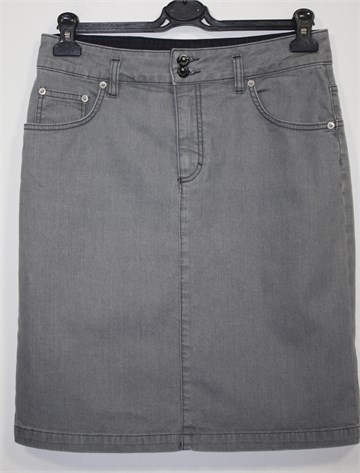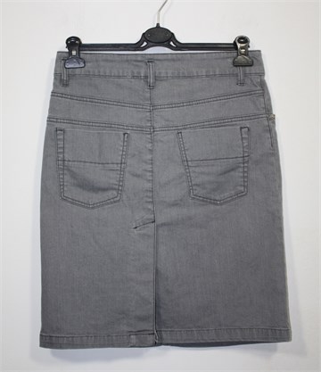 Suknja od trapera svijetlo sive boje. Prednji cif i kopčanje, pasica za remen. Prednji i stražnji džepovi, veći rasporak sa stražnje strane (po sredini). Blago rastezljiva.