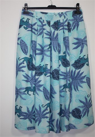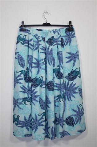 Duža suknja plave boje sa printom. Uska pasica za remen, stražnji cif i gumbić. Bočno na pasici blago stegnuta gumicama. Blago plisirana (sa obje strane), lagana i prozračna. Podstavljena.