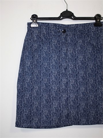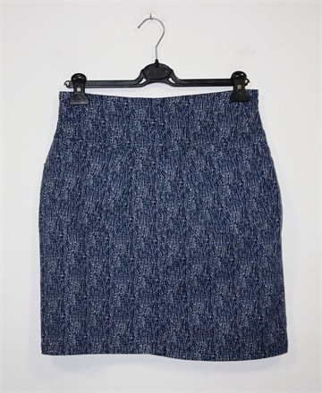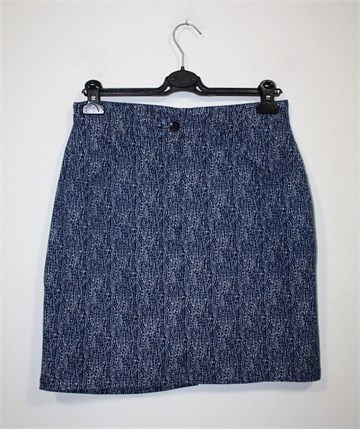 Suknja plavo-bijele boje s uzorkom na materijalu (kao na slici). Prednji cif i gumbić, prednji i stražnji džepovi (veći i dublji). Mali stražnji rasporak, podstavljena. Blago rastezljiva, koso rezana na dnu suknje.