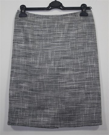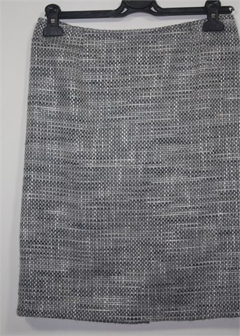 Suknja prošarano sivo-bijele boje, materijal je kao tanji i mekan štof (reljefni uzorak). Sa stražnje strane cif i mali rasporak (po sredini). Podstavljena.