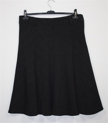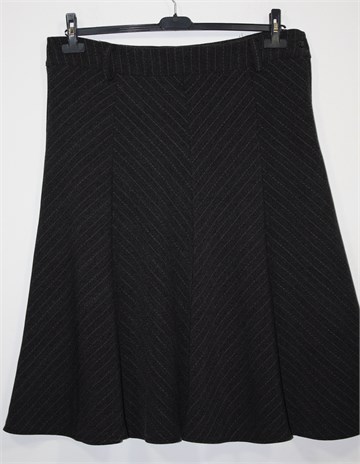 Suknja od debljeg i težeg štofastog materijala, tamno sive boje sa kosim prugama. Bočni cif i gumbić, pasica za remen.