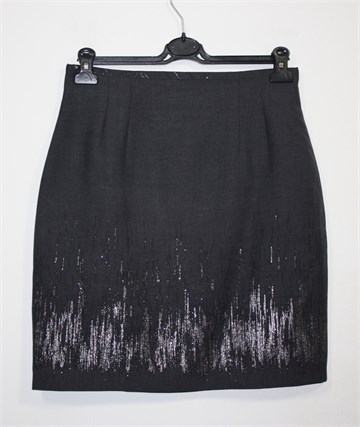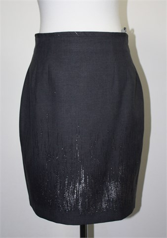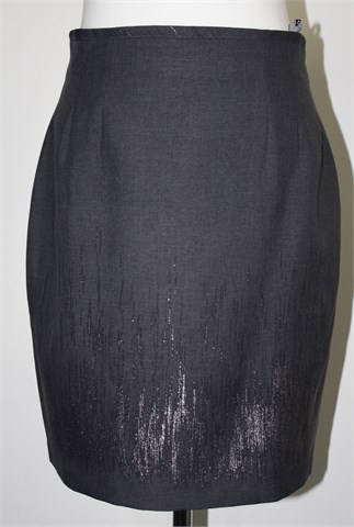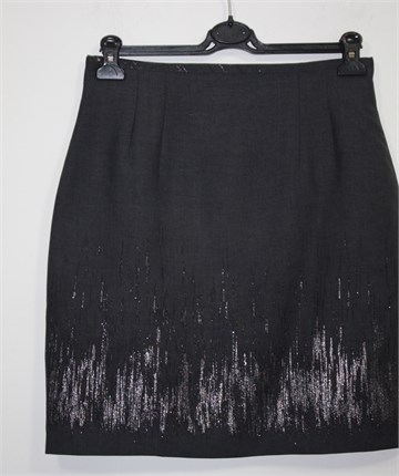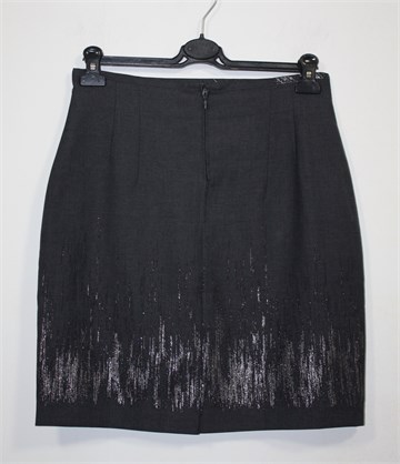 Suknja tamnije sive boje sa srebrnim šljokavim aplikacijama (sa obje strane). Stražnji cif i mali rasporak, ušitci ispod pasice (sa obje strane). Šira oko bokova, višlji struk. Podstavljena.