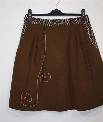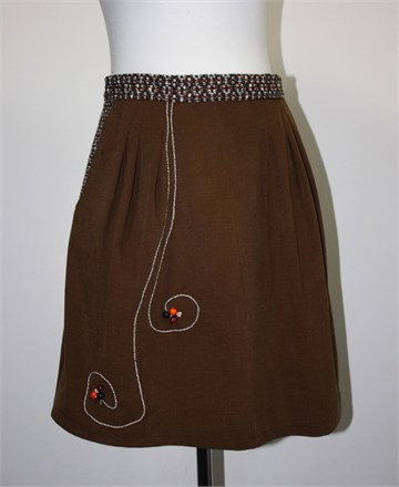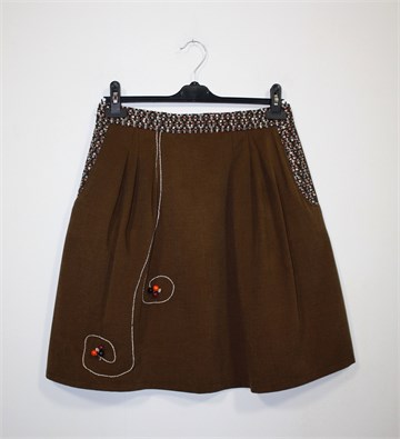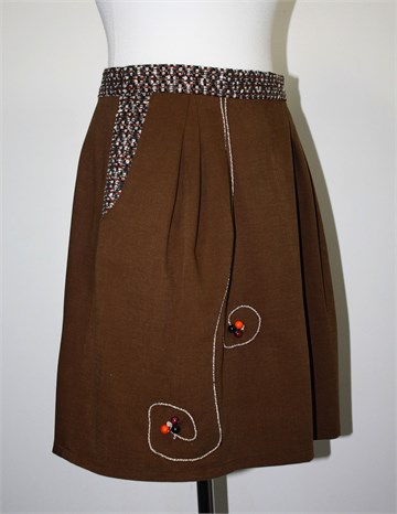 Unikatna suknja (profesionalno šivana) smeđe boje, pasica i bočni dijelovi od crnog materijala sa prošarano-špricanim uzorkom. Stražnji cif i gumbić, ušitci sa prednje strane. Aplikacije sa prednje strane su ručno šivane.