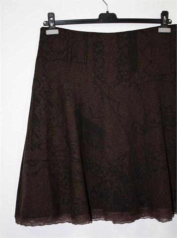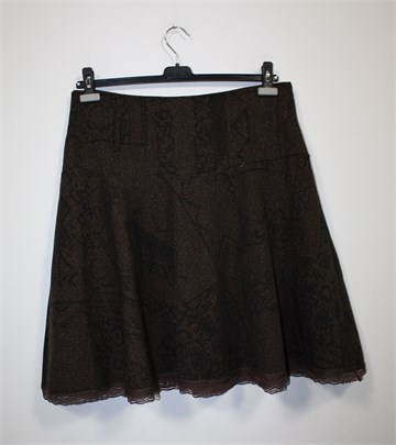 Suknja tamno smeđe boje sa crnim printom i zlatnim nitima (blago šljokava), šira u donjem dijelu. Pasica za remen, bočni cif. Na dnu je našivena čipkica, suknja je djelomično podstavljena (u gornjem dijelu).