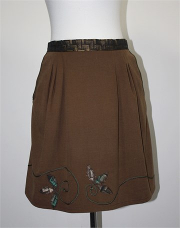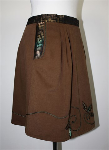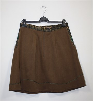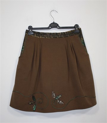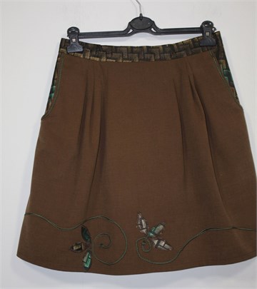 Unikatna suknja (profesionalno šivana) smeđe boje, pasica i bočni dijelovi od crnog materijala sa zeleno-bež uzorkom (blago sjajan materijal). Prednji bočni džepovi, stražnji cif i gumbić, ušitci sa prednje i stražnje strane. Aplikacije sa prednje strane.