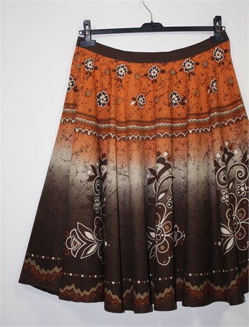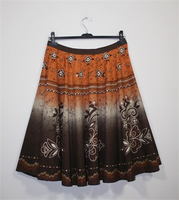 Pamučna suknja midi dužine, smeđe-tamnije narančaste boje sa prekrasnim printom (kao na slici). Bočni cif, sjeda na bokove (suknja radi puni krug pa predivno stoji). Čvrst ali lagan i prozračan pamuk.