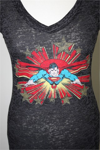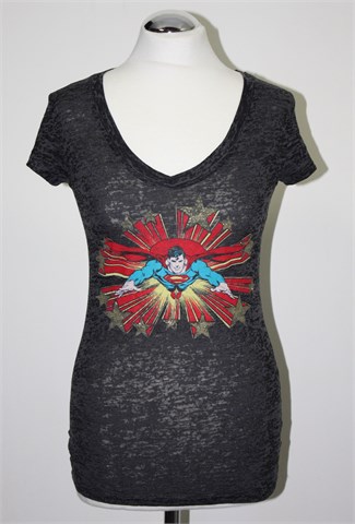 Majica sa kratkim rukavima, prošarano crno sive boje sa Superman printom (mjestimično šljokavim - neke su ispale). Mekan, rastezljiv i vrlo blago proziran materijal.