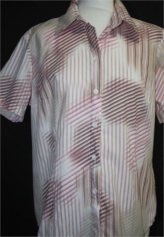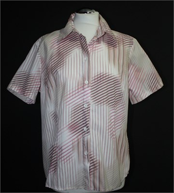 Sure košulja sa kratkim rukavima, bijele boje sa prugastim uzorkom. Prednje klasično kopčanje, prednji i stražnji ušitci (blago strukirana). Čvrst i nerastezljiv materijal.