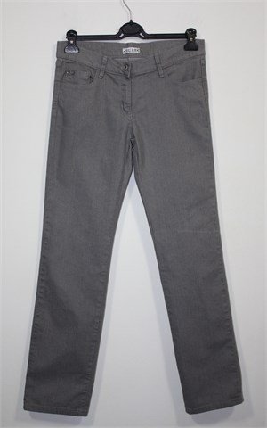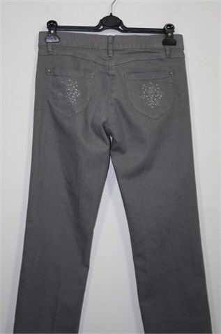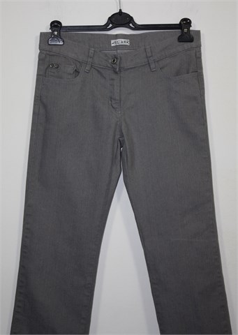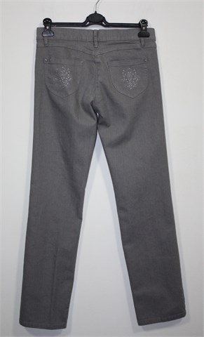 Sure jeans traper hlače sive boje, ravne nogavice. Prednji cif i kopčanje, pasica za remen. Prednji i stražnji klasični džepovi (stražnji ukrašeni aplikacijama). Vrlo ugodan, tanji i rastezljiv traper.