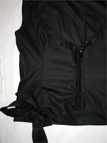 Šivan i unikatan prsluk. Crne boje sa našivenim perlicama. Na boku vezice koje se zavežu u mašnicu. Prednji dio se kopča sa sakrivenim kopčicama koje završavaju na pasici tako da djeluje kao da je na preklop. Prednji i stražnji ušitci, blago strukirana. Blago rastezljiv.