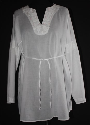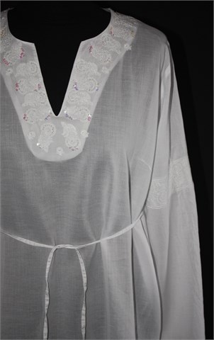 TCM dugačka košulja/tunika bijele boje s aplikacijama od konca i našivenim šljokicama. Široka, prozračna i lagana. Dugi rukavi, bočne špagice za vezanje.