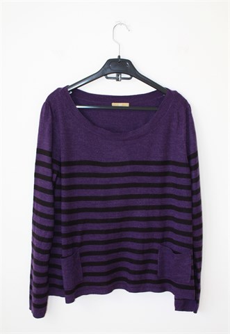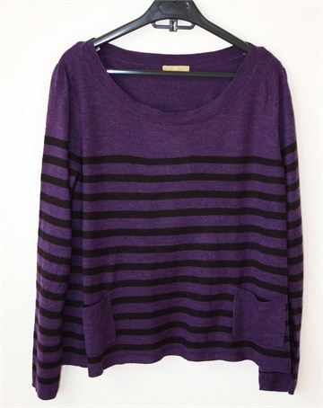 TU vesta sa dugim rukavima, tamnije ljubičaste boje sa crnim prugama. Prednji džepići, vesta se pri dnu širi. Tanje i rastezljivo pletivo.