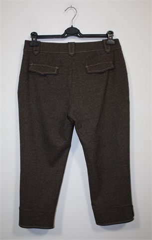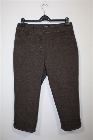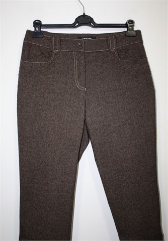 Taifun poluduge hlače prošarano smeđe-bež boje. Prednji cif i kopčanje, pasica za remen. Prednji bočni, stražnji lažni džepovi (samo preklopi). Mekan i rastezljiv materijal.
