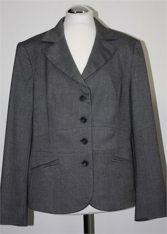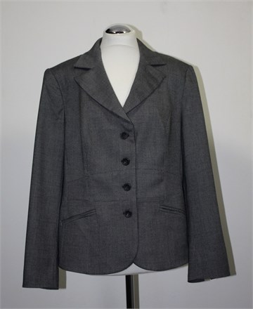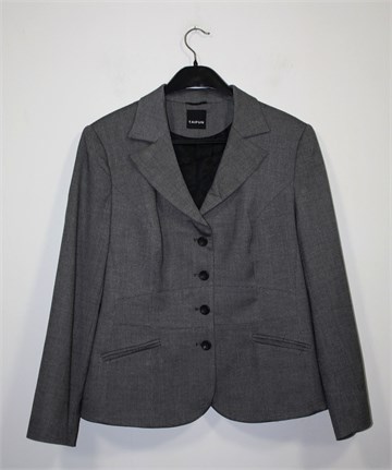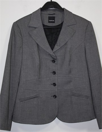 Taifun sako prošarano sive boje (sitni točkasti uzorak u sivo-bijelo-crnoj kombinaciji boja pa djeluje prošarano sivo). Prednje kopčanje, bočni džepovi. Jastučići u ramenima, mali prorezi na krajevima rukava. Podstavljen.