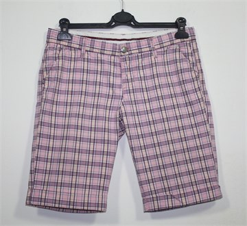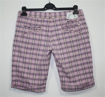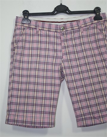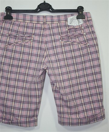 Take Two bermude roze boje sa prugasto-kariranim uzorkom (boje i uzorak kao na slikama). Prednji cif i kopčanje, pasica za remen. Prednji bočni, stražnji dublji džepovi. Tanji ali čvrst pamuk.