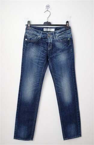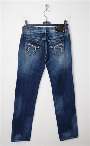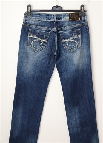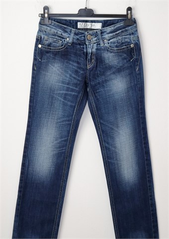 Take Two traper hlače plave boje - mjestimično ispranog i izlizanog izgleda (tvornički used look). Prednji cif i kopčanje, pasica za remen. Prednji i stražnji džepovi (stražnji ukrašeni prošivima od srebrnog konca). Niži struk, nisu rastezljive.