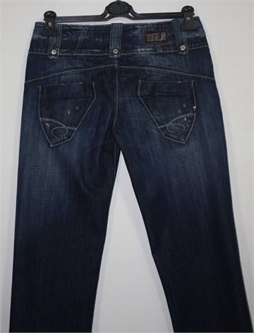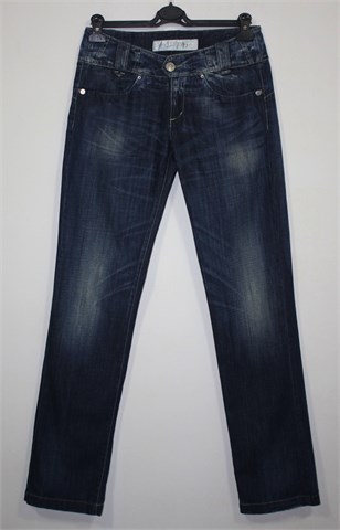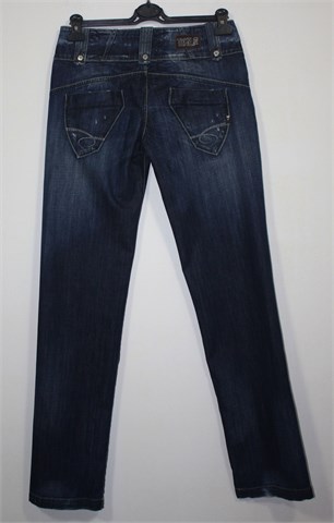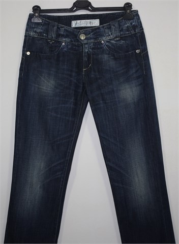 Take Two traper hlače, tamnije plave boje mjestimično ispranog i iscufanog izgleda (tvornički used look). Prednji cif i kopčanje, pasica za remen. Prednji i stražnji džepovi (stražnji ukrašeni aplikacijama od srebrnog konca). Used efekt po cijelim trapericama, najviše na dnu nogavica. Oznaka modela - Carol F20.