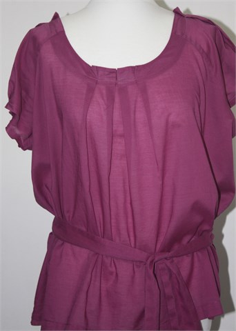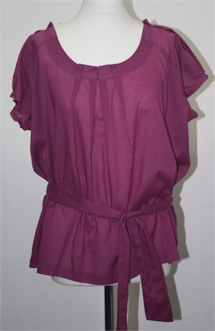 Talbots bluza u neobičnoj nijansi ciklama-ljubičaste boje (svijetli i pastelni ton), rukavi su kratki i blago pufasti. Sa stražnje strane (na sredini leđa) su dvije trake za vezanje. Prednji i stražnji ukrasni ušitci. Lagan i prozračan materijal.