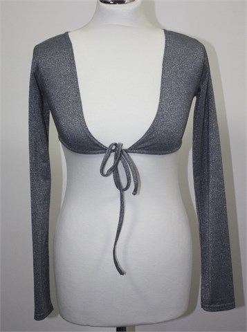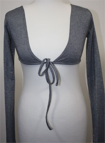 Tally Weijl bolero sa dugim rukavima, sivo-srebrne. Vezanje sa špagicama sa prednje strane, tanak i rastezljiv materijal.