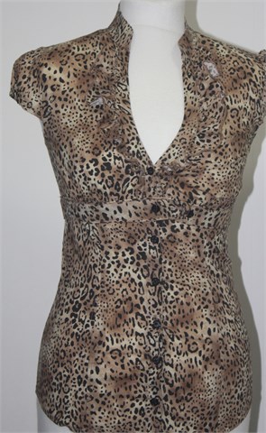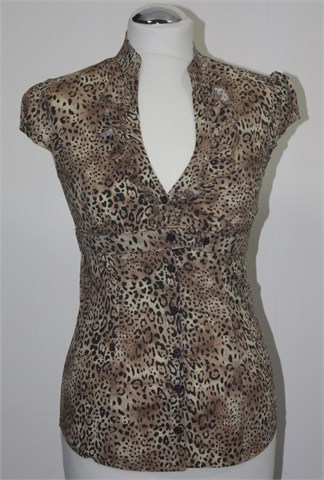 Tally Weijl košulja sa kratkim rukavima, smeđe-bež boje sa crnim animal uzorkom. Prednje kopčanje i ukrasni volančići oko dekoltea, rezana ispod grudi. Čvrst i blago rastezljiv materijal.