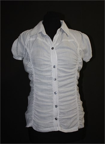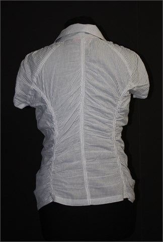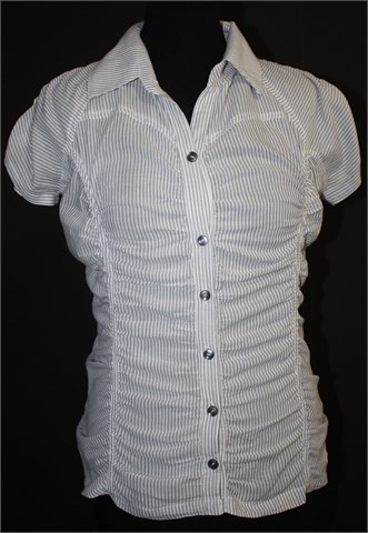 Tally Weijl košulja sa kratkim rukavima, bijele boje sa sivim prugama. Prednje kopčanje, gumbić i gumica na rukavima. Sa prednje i stražnje strane prošivena gumicama pa je vrlo neobična i odlično stoji :)