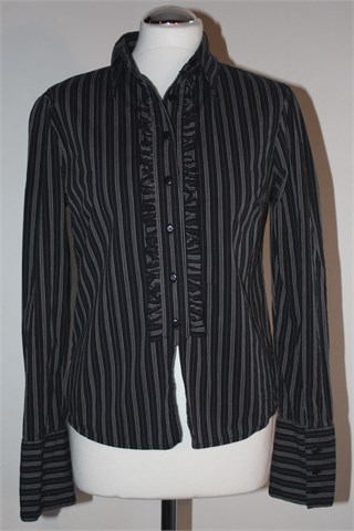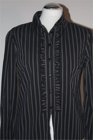 Tally Weijl košulja crne boje sa bijelim prugama i prednjim ukrasnim volančićima oko kopčanja. Prednje klasično kopčanje, prednji i stražnji ušitci. Blago rastezljiva.