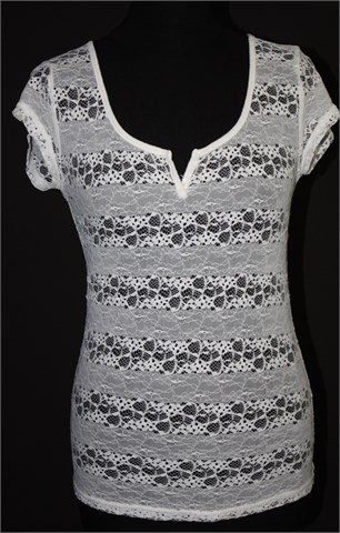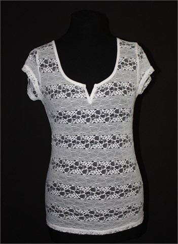 Tally Weijl majica sa kratkim rukavima prljavo bijele boje, materijal je imitacija rastezljive čipke (rastezljivi til sa uzorkom čipke). Tanka, providna i vrlo rastezljiva.