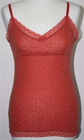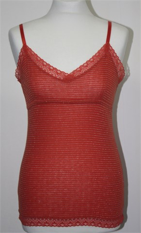 Tally Weijl topić tamnije narančasto-crvene boje sa srebrnim prugama i ukrasnom čipkicom. Naramenice su prilagodljive (kao na grudnjaku), rastezljiva gumica ispod grudiju. Mekan, lagan i rastezljiv materijal.