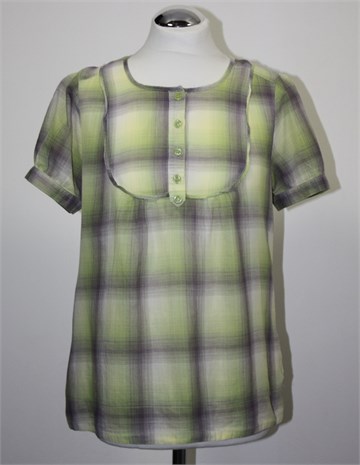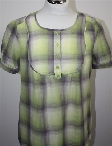 Tara bluza sa kratkim rukavima, sivo-zelene boje sa prugasto-kariranim uzorkom. Prednje kopčanje sa gumbima, gumbić na kraju svakog rukava. Vrlo tanak i mekan pamuk, blago proziran.