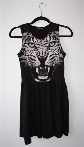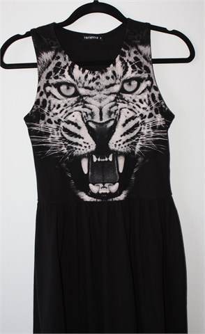Terranova haljina bez rukava, crne boje sa prednjim printom (nude-roze boje, uzorak printa kao na slikama). Gumica u struku, prema dnu donji dio haljine se blago širi od tijela. Tanja i rastezljiva.