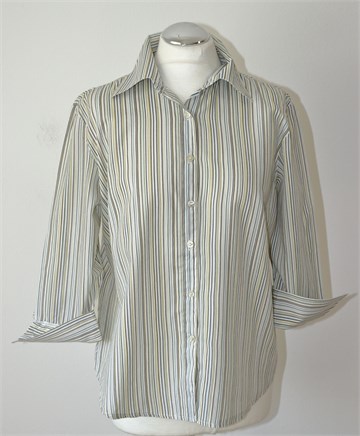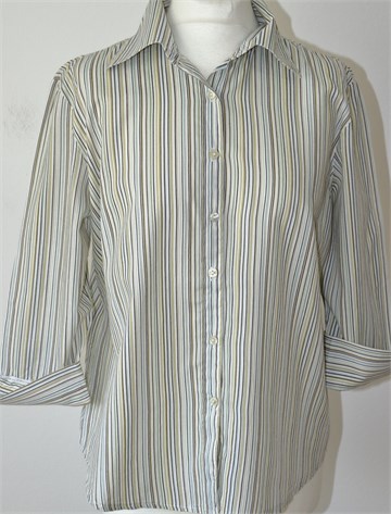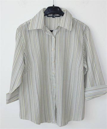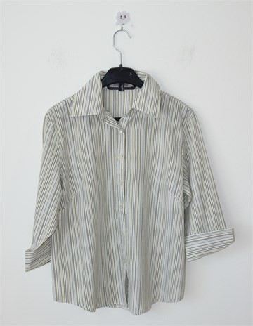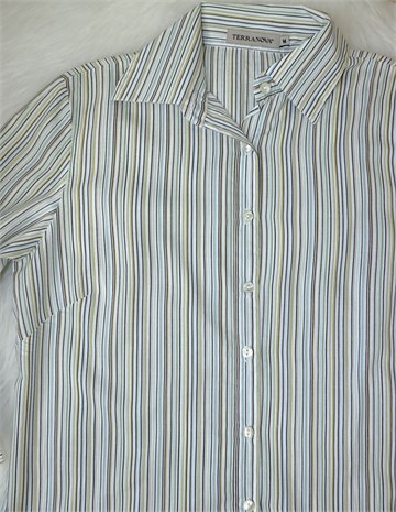 Terranova košulja sa poludugim rukavima, bijele boje sa prugama u raznim bojama (vidljivo na slikama). Prednje kopčanje, ušitci (blago strukirana). Lagan materijal, nije rastezljiv.