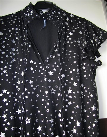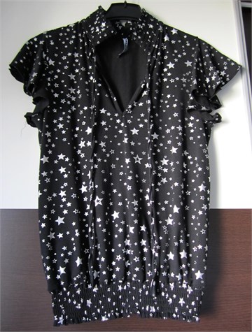 Terranova majica/bluza crne boje sa printom srebrnih zvijezdica. Na pasici i kragni su proštepane gumice ("žabice"), iznad dekoltea špagica za vezanje. Jako mekan i lagan materijal. Jako neobična i lijepa majica.