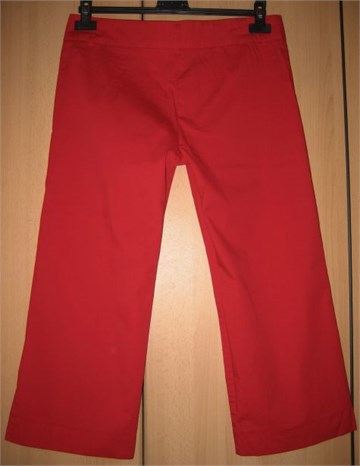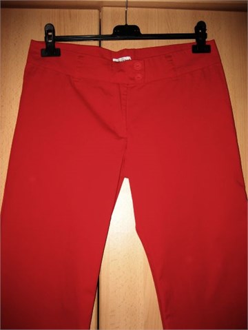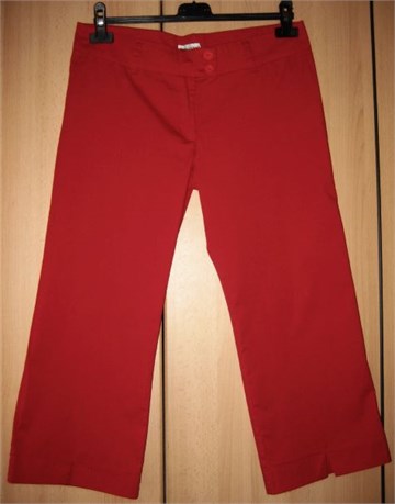 Poluduge hlače crvene boje, vrlo lagane i rastezljive, idealne za ljeto. Prednji cif i gumbići, pasica za remen. Nemaju džepove. Veličina piše 30/M/44, odgovaraju veličini 40. Boja je crvena, svijetlija nego na slici.