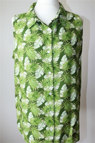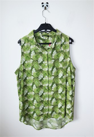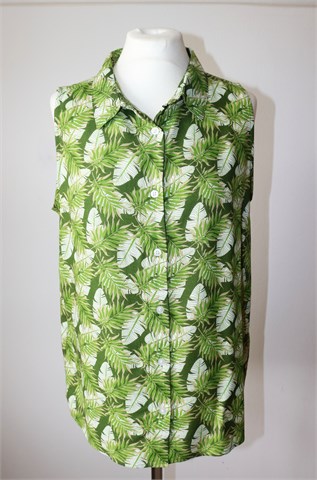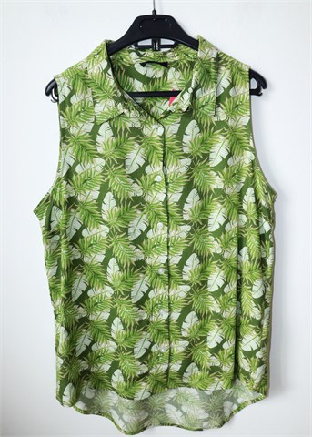 Tessentials košulja sa printom, bez rukava (boje i uzorci printa vidljivi na slikama). Prednje kopčanje, duža sa stražnje strane (vidjeti mjere). Nije rastezljiva.