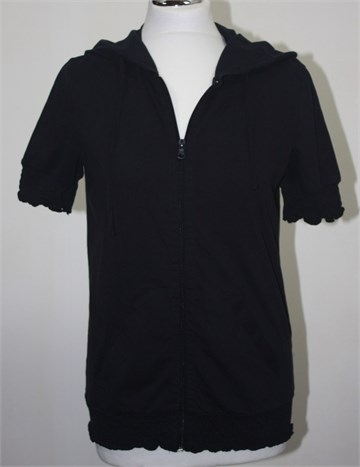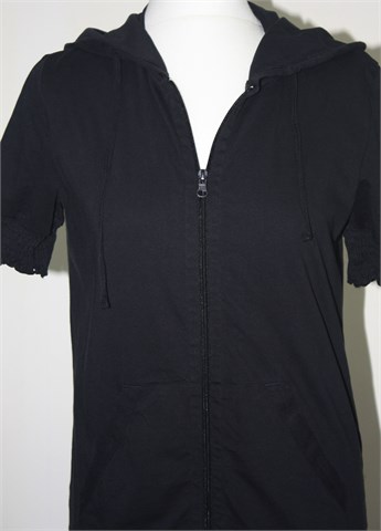 Tezenis majica sa cifom i kapuljačom, crne boje. Kratki rukavi, klokan džep sa prednje strane. Stegnuta gumica na krajevima rukava i na dnu pasice. Tanji pamuk, blago rastezljiv.