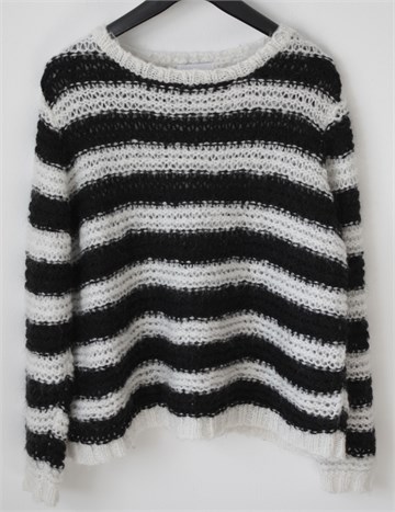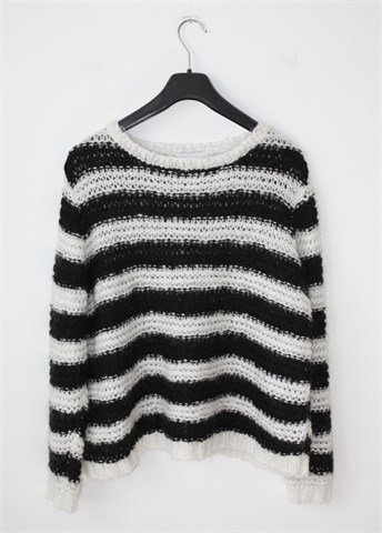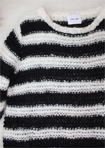 The Lab oversized prugasta vesta u kombinaciji crne i bijel eboje. Rupičasto i mucasto pletivo, srednje debljine. Rastezljiva.