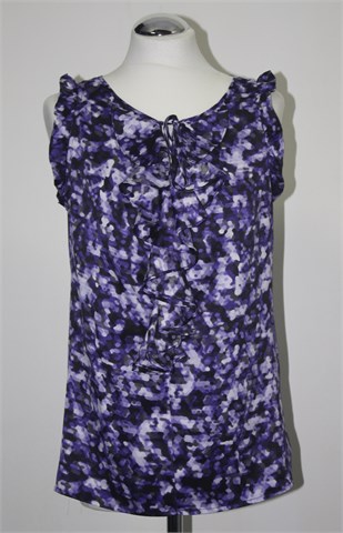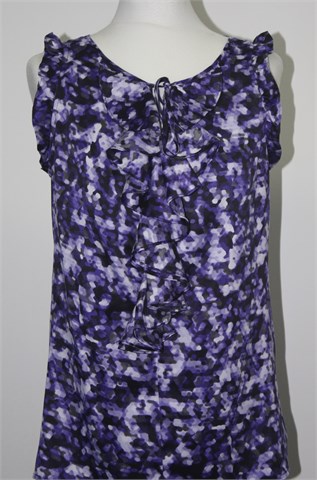 The Limited bluza bez rukava, prošarano ljubičaste boje sa printom. Volančići oko otvora rukava i sa prednje strane. Lagan i svilenkast materijal, nije rastezljiva.