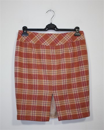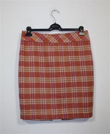 The Limited suknja, pretežno narančaste boje sa prugasto-kariranim uzorkom (boje kao na slici). Bočni cif i kopčica, mali stražnji rasporak. Podstavljena.